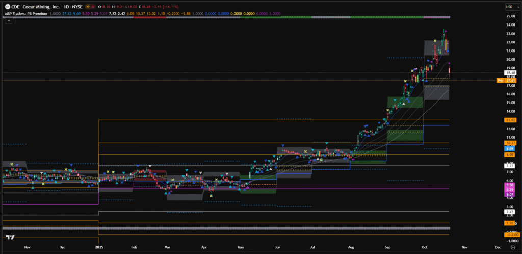Coeur Mining (CDE) has caught the attention of traders recently after a sharp fall of more than 25% in just a few trading days. In this blog, we’ll break down the stock’s performance using pivot points, analyze the recent pullback, and understand what’s happening at current price levels.