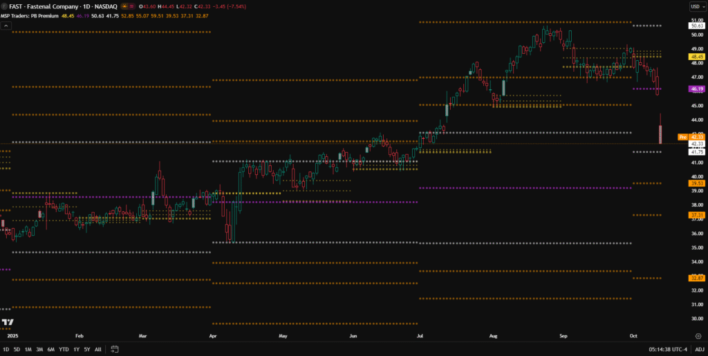 In summary, while the sudden drop may appear concerning on the surface, it fits well within the context of a larger uptrend. The zones around 41.75, 39.53, and 37.31 should be watched closely for signs of stabilization. Any meaningful acceptance or buying interest near these areas could set the stage for the next leg higher in FAST.